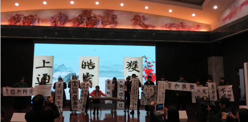 11月7日下午,“书以载道,墨海联谊”中日青少年书法交流大会在冀东书画艺术馆隆重举行。唐山市文联、唐山市文广新局、唐山市社科联、唐山市新联会、唐山盛唐发展总部、tyc3556太阳集团城网址、日本大阪教育大学、中国张裕钊书法研究会、唐山市胥各庄小学的领导和师生代表、广大书法爱好者以及社会各界人士约300人参加了此次活动。唐山市文联副主席罗旭东、盛唐发展总部党群工作部部长薛玉国、tyc3556太阳集团城网址国际交流中心主任李丽娜、唐山市胥各庄小学校长孙士尊、大阪教育大学教授加藤可奈卫、渡边美香、出野文莉、冀东书画艺术馆馆长陈启壮分别致辞。中日两校大学生代表上台发言。冀东书画艺术馆副秘书长党智多主持本次大会。大会现场进行了中日书法家、学生代表的书法展示以及古琴、茶艺等中华传统文化的展示活动。唐山电视台直播50分、腾讯网、网易新闻、长城网对本次活动进行了报道。